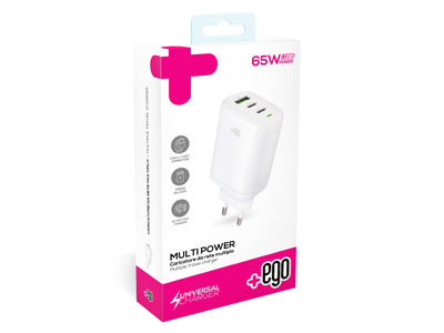 Caricabatterie da rete universale dotato di uscite USB-A (QC) e 2 USB-C (PD) con tecnologia Power Delivery per una ricarica ultra rapida.