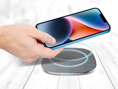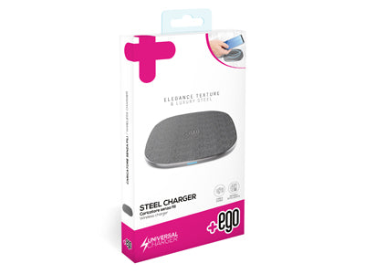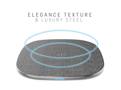 Base di ricarica senza fili con elegante texture esterna gommata e alluminio satinato. Funzione di ricarica rapida se supportata dal dispositivo e abbinato a caricatore USB idoneo.