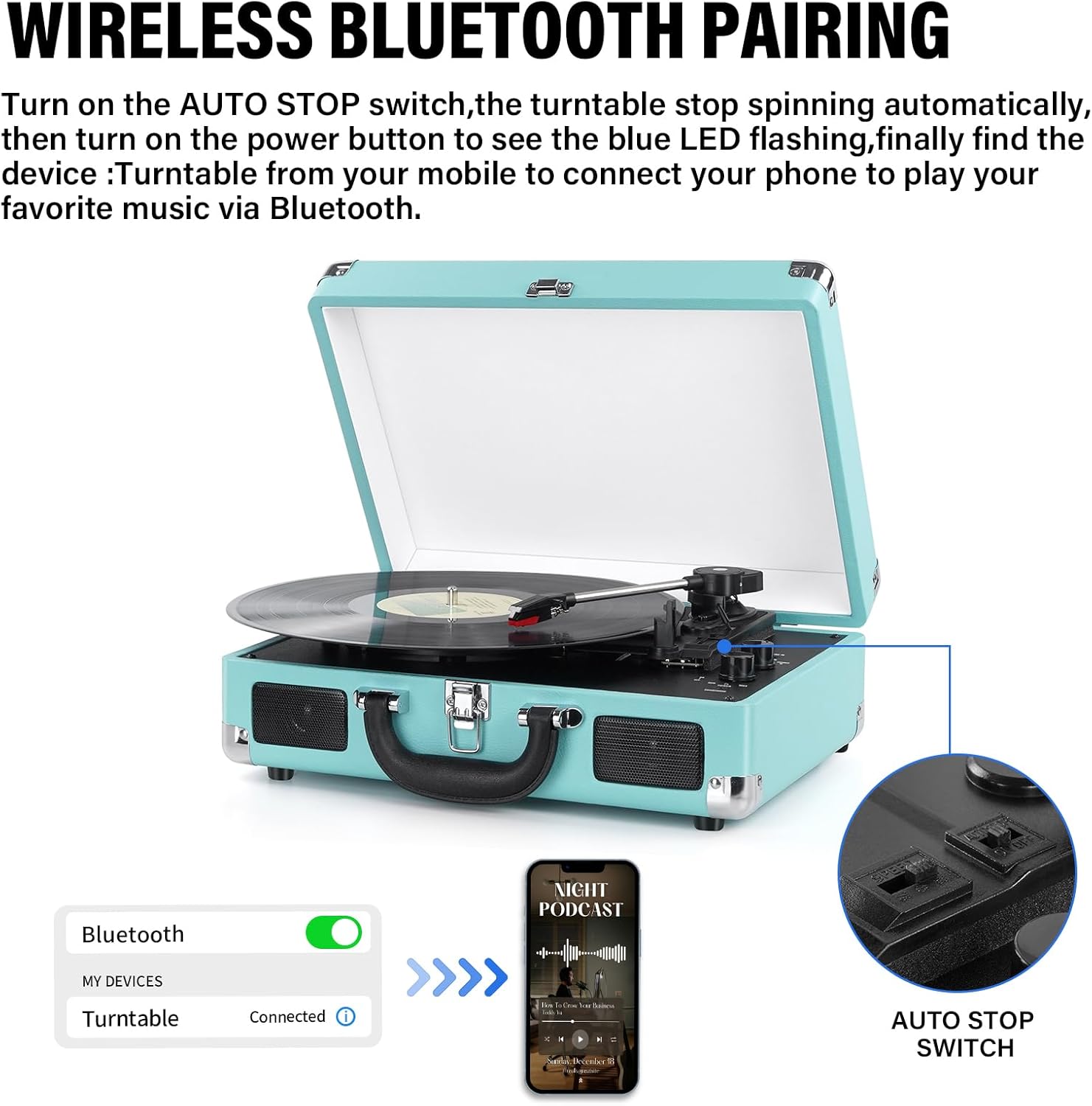 Giradischi Bluetooth, con 3 velocità e altoparlanti integrati, con uscita RCA/AUX-IN