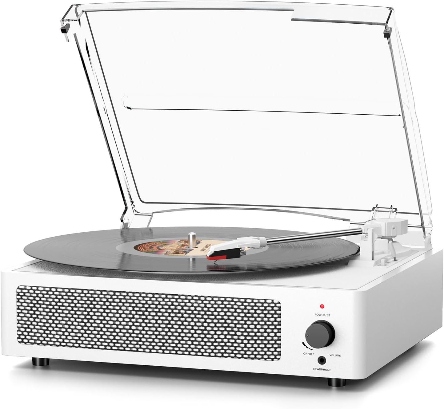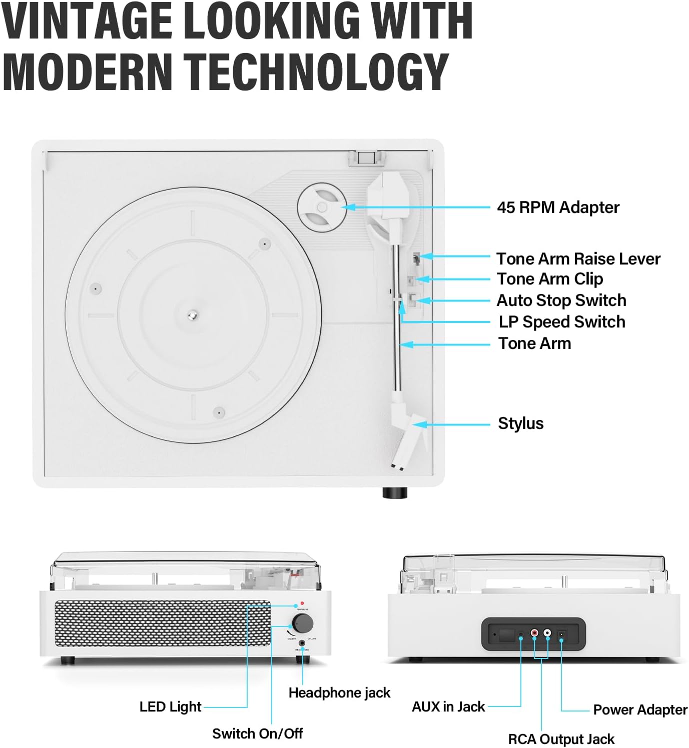 Giradischi dal look retrò】Senti il calore del tempo e il fascino della musica con questo giradischi di ispirazione vintage, un mix perfetto di stile retrò e moderno. Ideale per amanti della musica di tutte le età, questo giradischi è il regalo perfetto per la tua famiglia e gli amici amati in qualsiasi festival. 【Giradischi Bluetooth wireless】 Entra in un mondo di libertà musicale con il nostro giradischi Bluetooth wireless. Goditi la comodità di trasmettere i tuoi brani preferiti dal tuo telefono o tablet, dì addio ai fili aggrovigliati e ciao al suono fluido e di alta qualità con un tocco di fascino retrò. 【Supporto per lettore di dischi con altoparlante integrato】Nessun bisogno di altoparlanti aggiuntivi, altoparlante stereo dinamico a gamma completa integrato, basta collegare gli altoparlanti esterni alimentati tramite l'uscita RCA per una migliore qualità del suono. Goditi la riproduzione di musica tramite AUX o Bluetooth, offrendo versatilità per le tue preferenze di ascolto. 【Giradischi a 3 velocità e 3 dimensioni】Scopri un braccio di lettura bilanciato con controllo del braccio di sollevamento regolabile, supporta la lettura a 3 velocità (33-1/3, 45 e 78 giri/min) e può ospitare 3 dimensioni di dischi (7'', 10'' e 12''). Goditi ogni pezzo della tua collezione di dischi con facilità e precisione. SUGGERIMENTI: Quando si posiziona un disco in vinile da 12 pollici sul platino, inclinarlo delicatamente verso il braccio di lettura per garantire una lettura corretta. 【Giradischi antivibranti con trasmissione a cinghia】La nostra base di platino adotta un design a molla e trasmissione a cinghia per offrire un eccellente assorbimento degli urti e ottimizzare la qualità del suono, offrendoti un'esperienza audio reale e ricca. Il coperchio antipolvere trasparente è facile da rimuovere, il che può proteggere efficacemente la tua preziosa collezione di dischi in vinile, permettendoti di immergerti nella musica nostalgica del puro vinile.