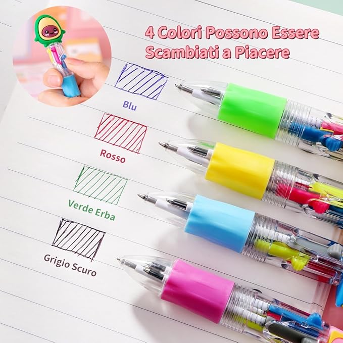 Divertenti penne 4 in 1 con quattro colori vivaci (blu, nero, rosso, verde) in uno, ideali per ravvivare aule e borse per feste.
